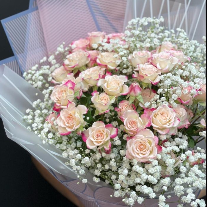 Гипсофила – 6 шт.Лента атласная – 2 шт.Упаковка дизайнерская – 6 шт.Кустовая роза 60 см – 7 шт.