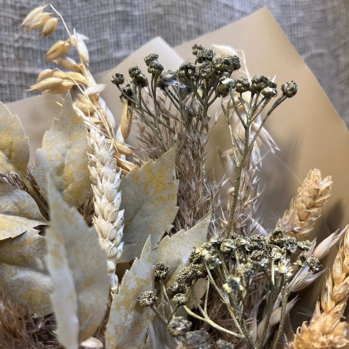 Лента атласная – 1 шт.Пшеница – 10 шт.Овес – 5 шт.Корейская упаковка – 1 шт.тысячелистник сухоцвет – 3 шт.искуственные листья – 3 шт.злак метелка – 5 шт.